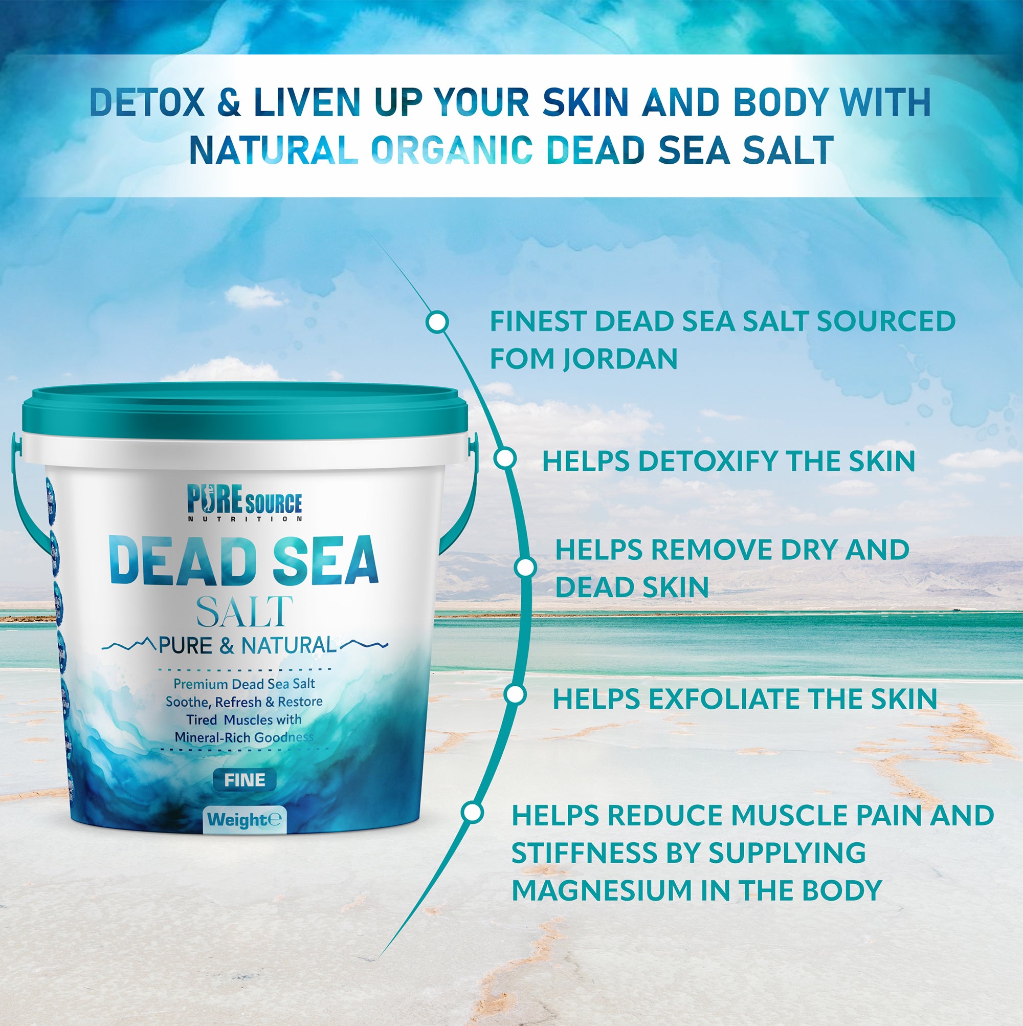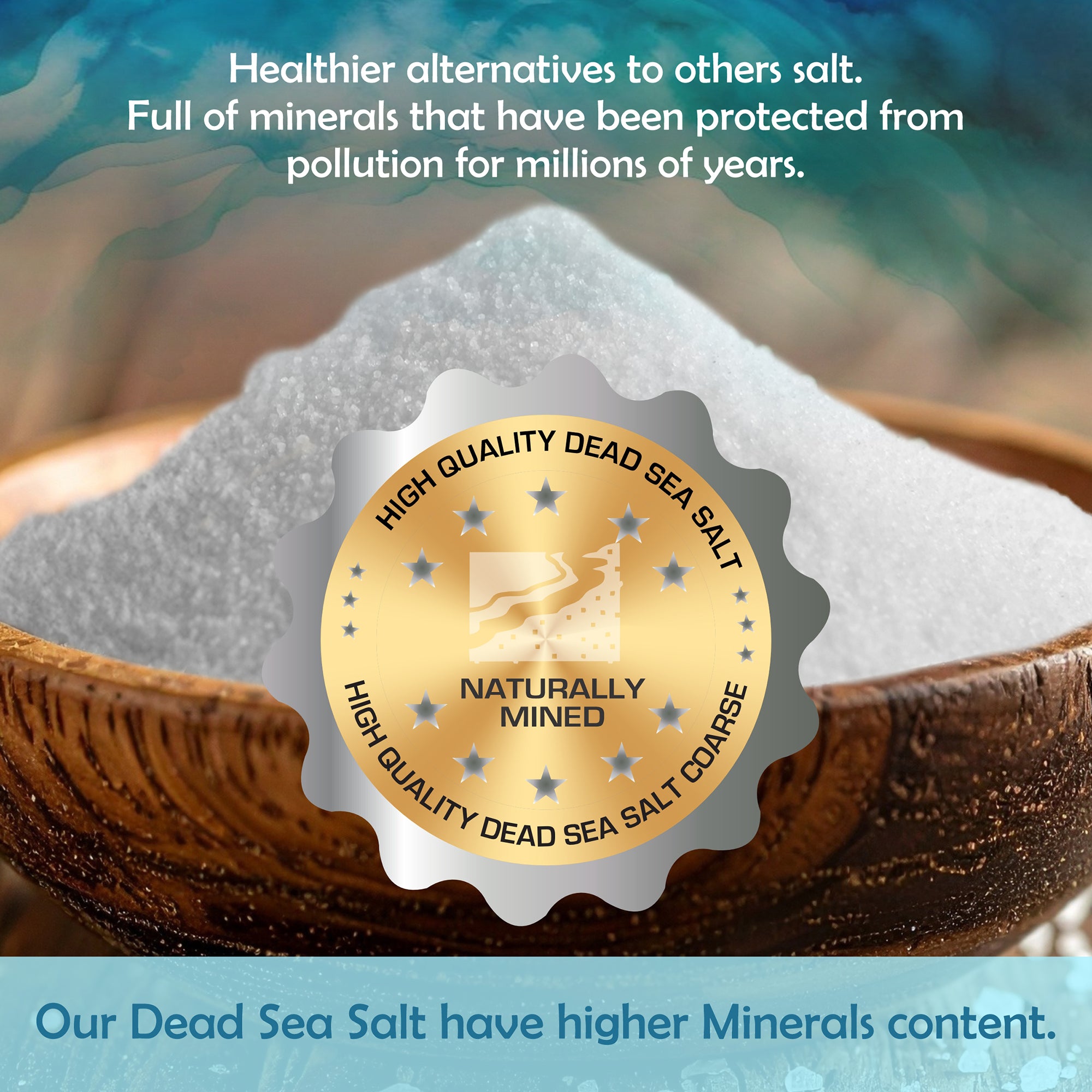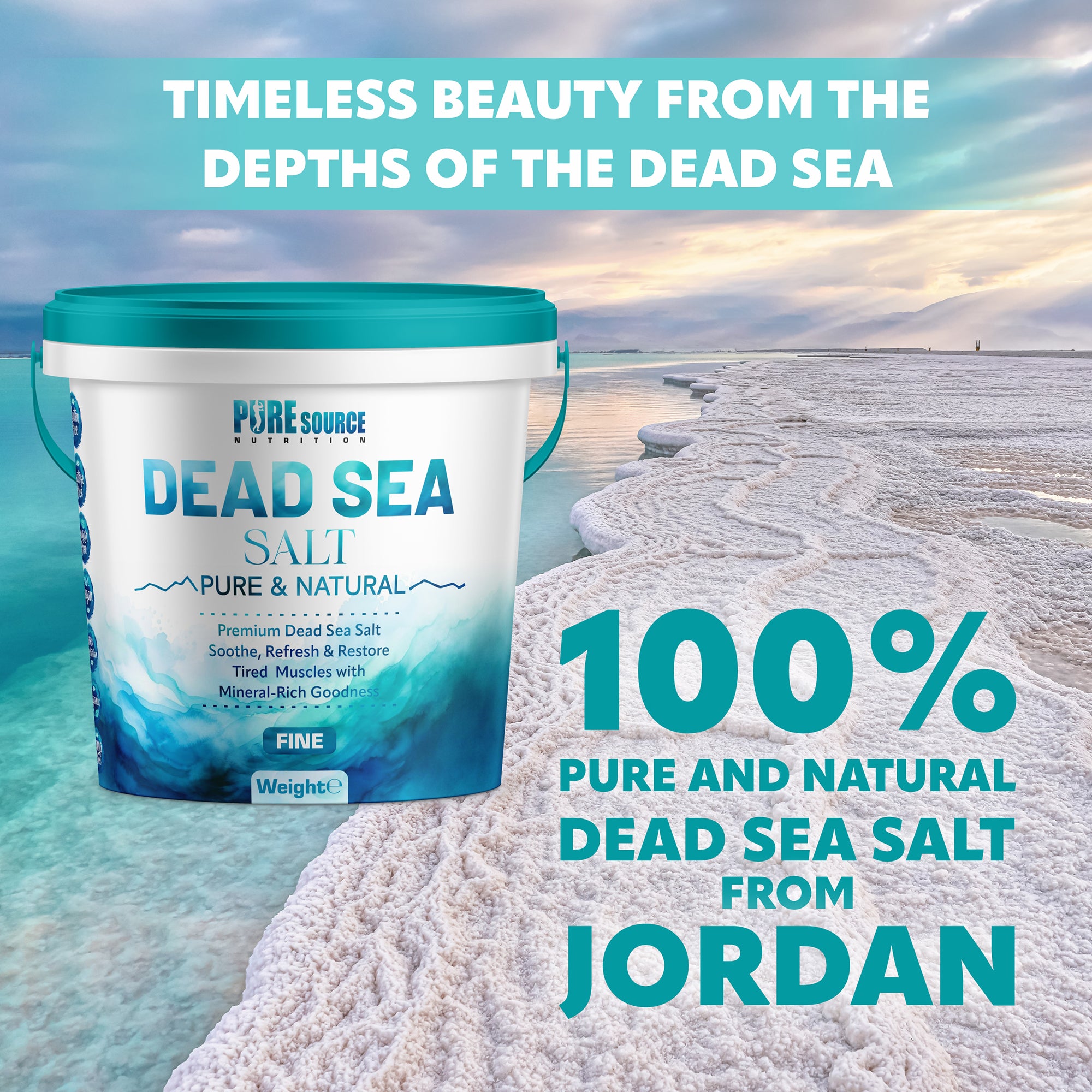 Dead Sea Salt Fine -1mm — 100% pure, with no additives or synthetic fragrances.
